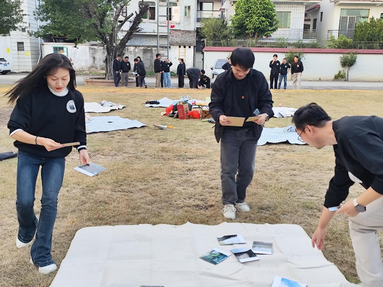 午后的草坪上,全体人员随机分组后开展破冰活动和趣味互动游戏。“接力画画”环节中,队员们在15秒内接力创作,凭借默契配合完成题目作答,充分展现团队的快速反应与协作能力;“协作拼图”游戏里,大家接力取回被分割的甘竹滩景点照片碎片,共同组装还原工业景观,在过程中重温了甘竹滩的历史记忆。