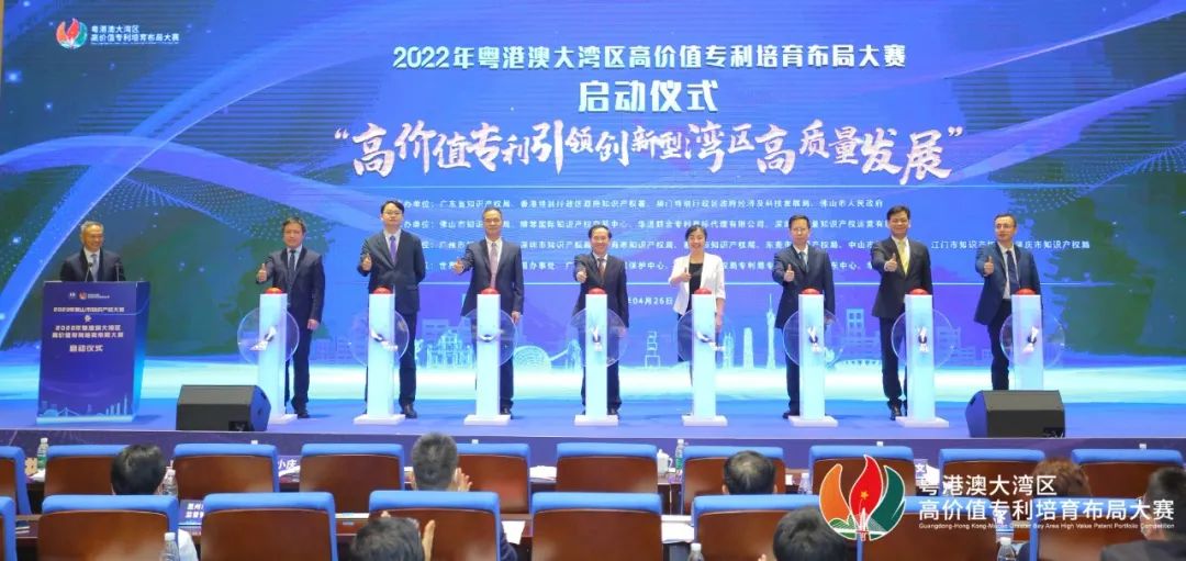 2022年粤港澳大湾区高价值专利培育布局大赛以“高价值专利引领创新型湾区高质量发展”为主题,由广东省市场监督管理局(知识产权局)、香港特别行政区政府知识产权署、澳门特别行政区政府经济及科技发展局、佛山市人民政府共同主办。广东省市场监督管理局(知识产权局)一级巡视员何巨峰、佛山市人民政府副市长黄少文出席启动仪式并致辞,世界知识产权组织中国办事处主任刘华、香港特别行政区政府知识产权署署长黄福来、澳门特别行政区政府经济及科技发展局代局长陈子慧通过线上方式致辞。