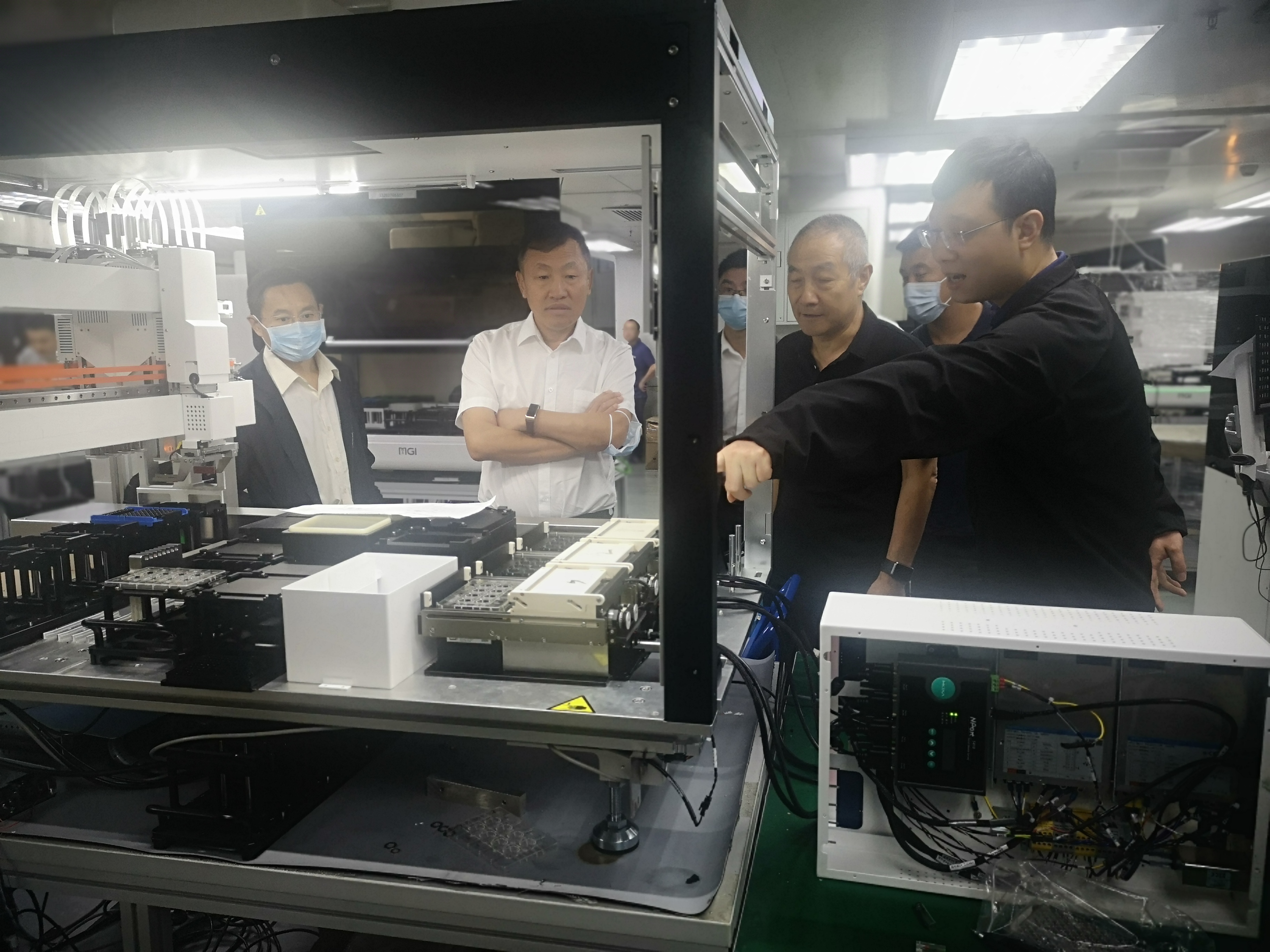 华大集团董事长、联合创始人汪建陪同调研组一行先后参观了华大基因/智造实验室、时空大楼新址和深圳国家基因库,介绍了基因测序仪自动化生产产线、产品技术更新研发平台、知识产权保护情况、深圳国家基因库三库两平台(干库、湿库、活库、测序平台和合成平台)。