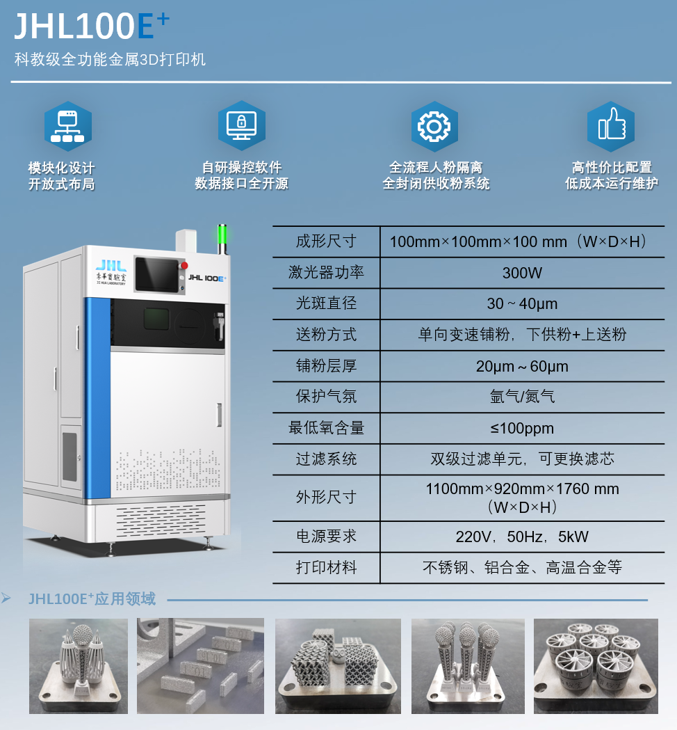 金属3D打印作为先进制造领域最具潜力的技术之一,已经从科研逐步走向工业规模化生产,包括航空航天、新能源、工业模具等领域。为了满足国内职业院校在3D打印技能人才培养的方面需求,季华实验室金属增材制造团队成功研制出首款全功能国产化科教级金属选区激光熔化(SLM)打印机JHL100E+,使其成为增材制造专业技术人员培训的优选。