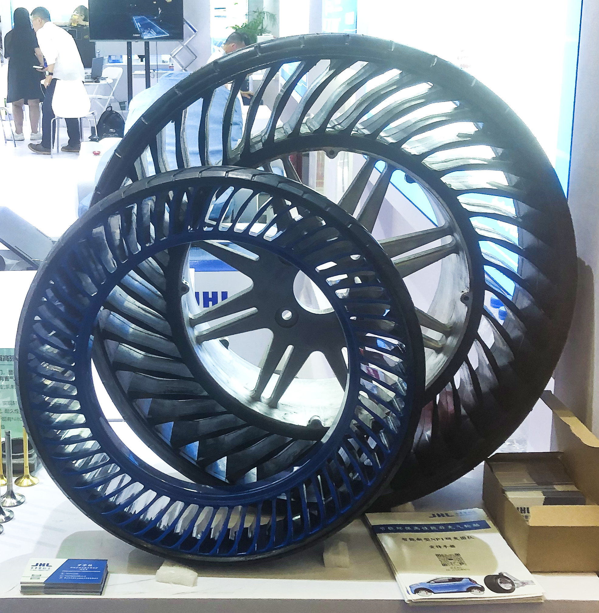 “节能环保高性能非充气轮胎”由支撑体取代充气轮胎胎压作用,具有免维护、免爆胎、免泄漏的特点,与传统充气轮胎相比安全可靠、绿色环保、综合寿命长、工艺流程少,更易实现智能化,可广泛应用于多种领域移动装备,全球市值超万亿元。产品引入自主研发的可循环利用聚氨酯材料,助力轮胎行业实现“碳中和”的国家级环保战略。参展的微型共享汽车非充气轮胎(FS-NPT 175/70 N14)最高时速可达100km/h,最大载荷500kg,尖锐物体刺穿后行驶性能下降≤20%,抵抗破坏能力强,缓冲和操控性能优异。