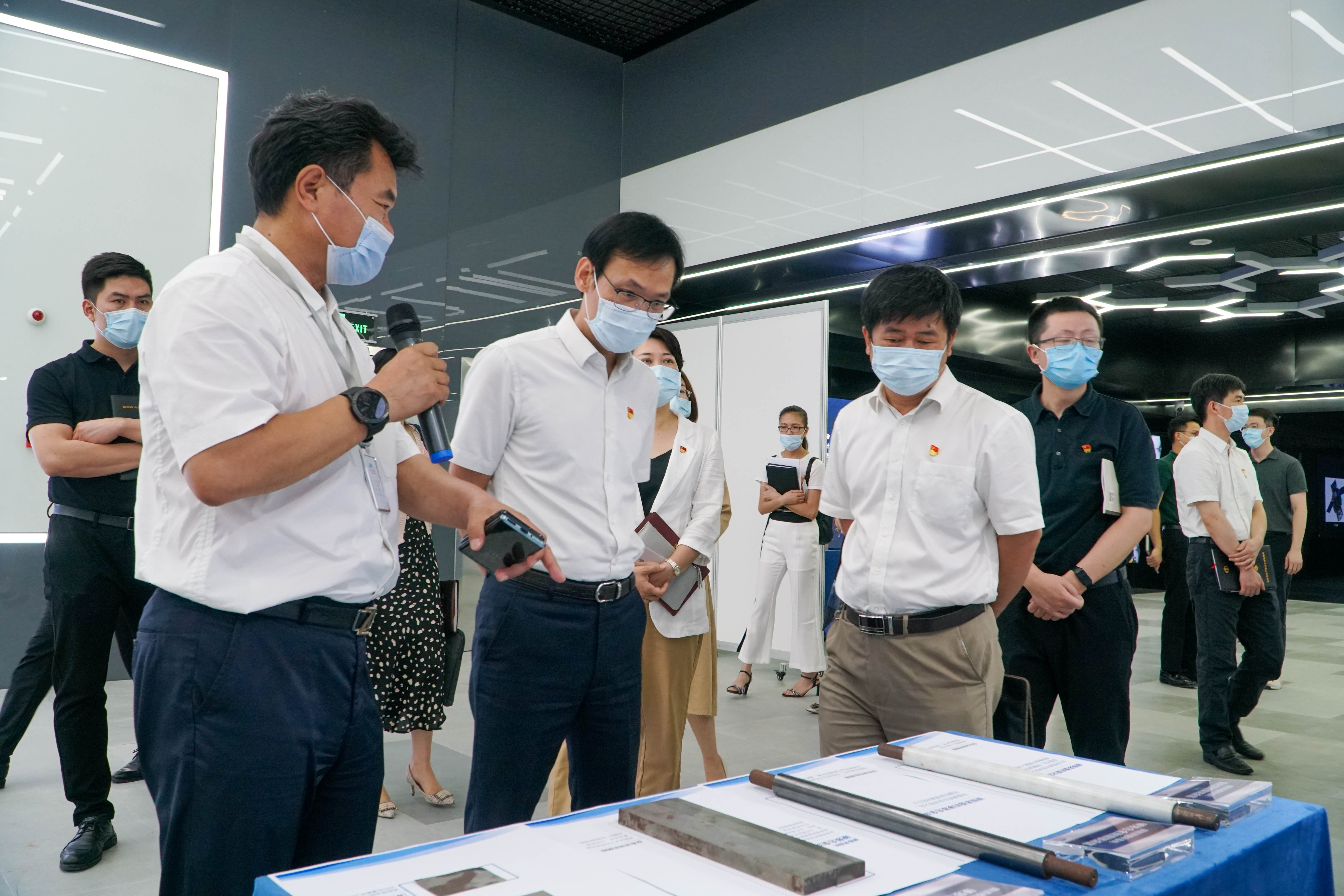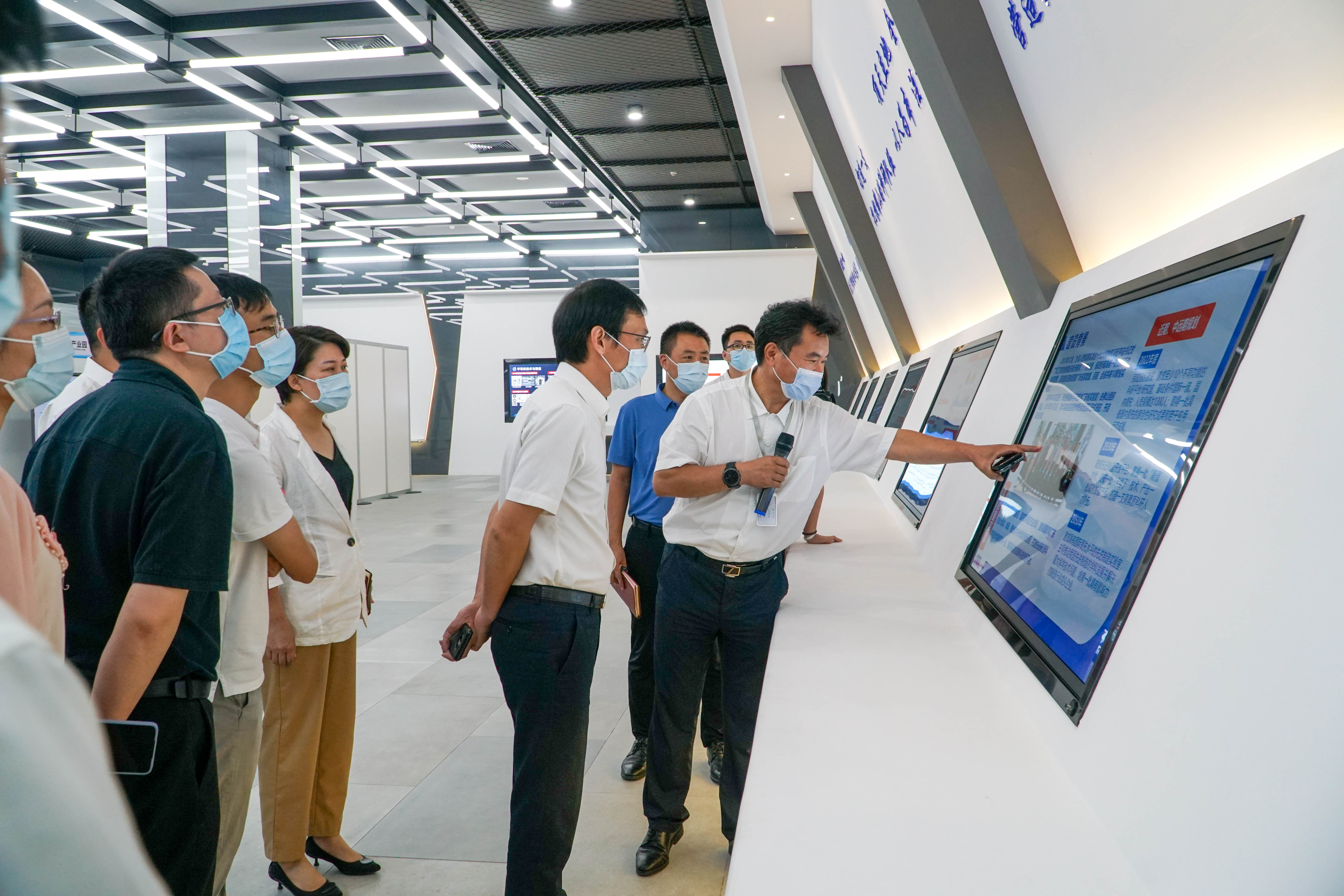 最后,在季华实验室主任助理、党支部副书记甘泽龙的带领下,实地参观了实验室展厅。甘书记简洁明了地介绍了实验室的建设历程、组织架构、基础设施建设、发展目标、建设模式、研究方向、体制机制创新、人才队伍建设、原创科研成果产出、成果转移转化等情况。