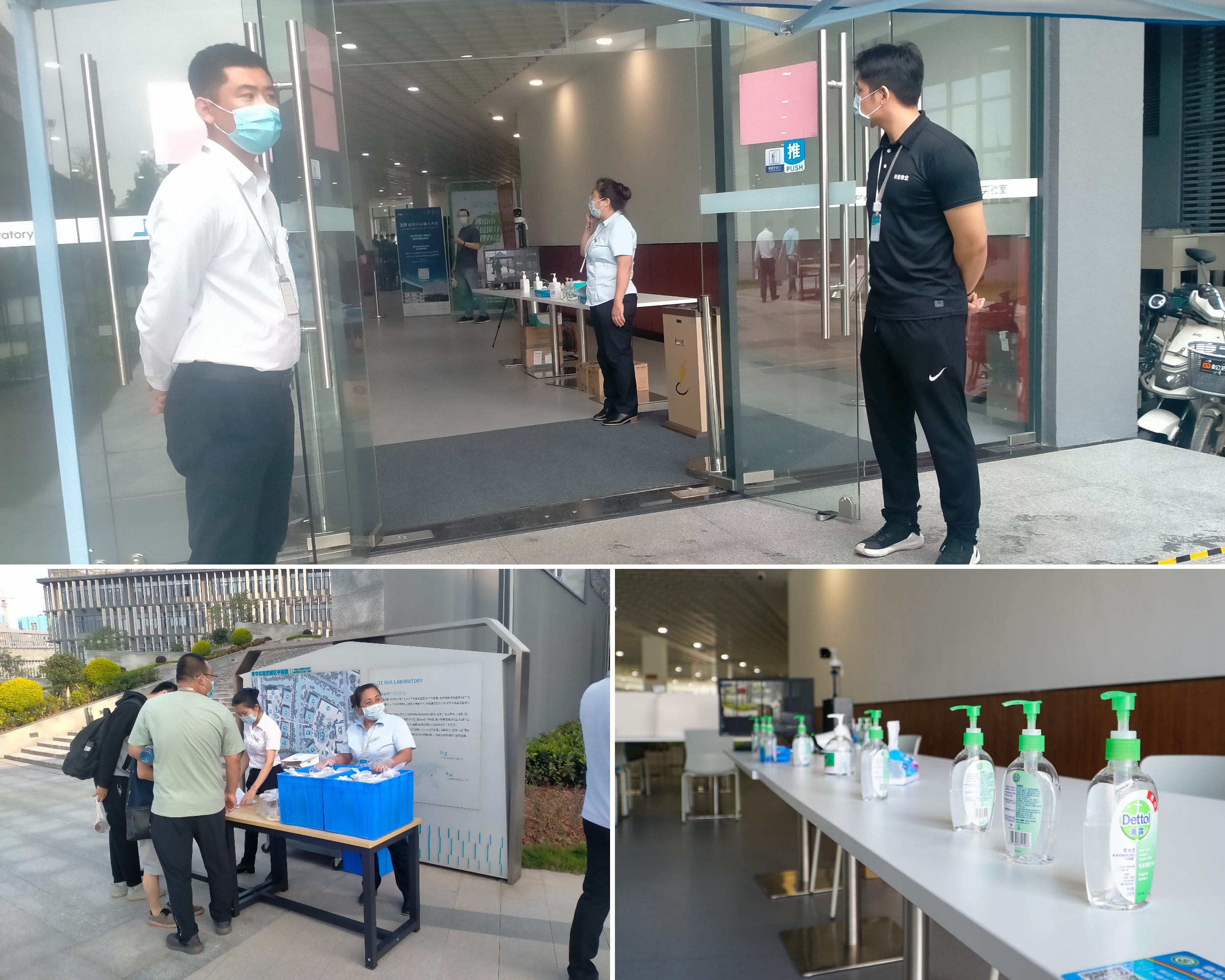 4月13日,实验室积极响应桂城街道全域实行围合管理的通告,全面实施围合管理,禁止外来人员入内,内部人员须提供有效核酸采样记录方可入场办公。为确保实验室食堂安全有序供餐,食堂实行测温、分批分时段就餐、合理间隔等措施,并为因疫情防控无法堂食的员工特设打包服务,避免人员聚集。