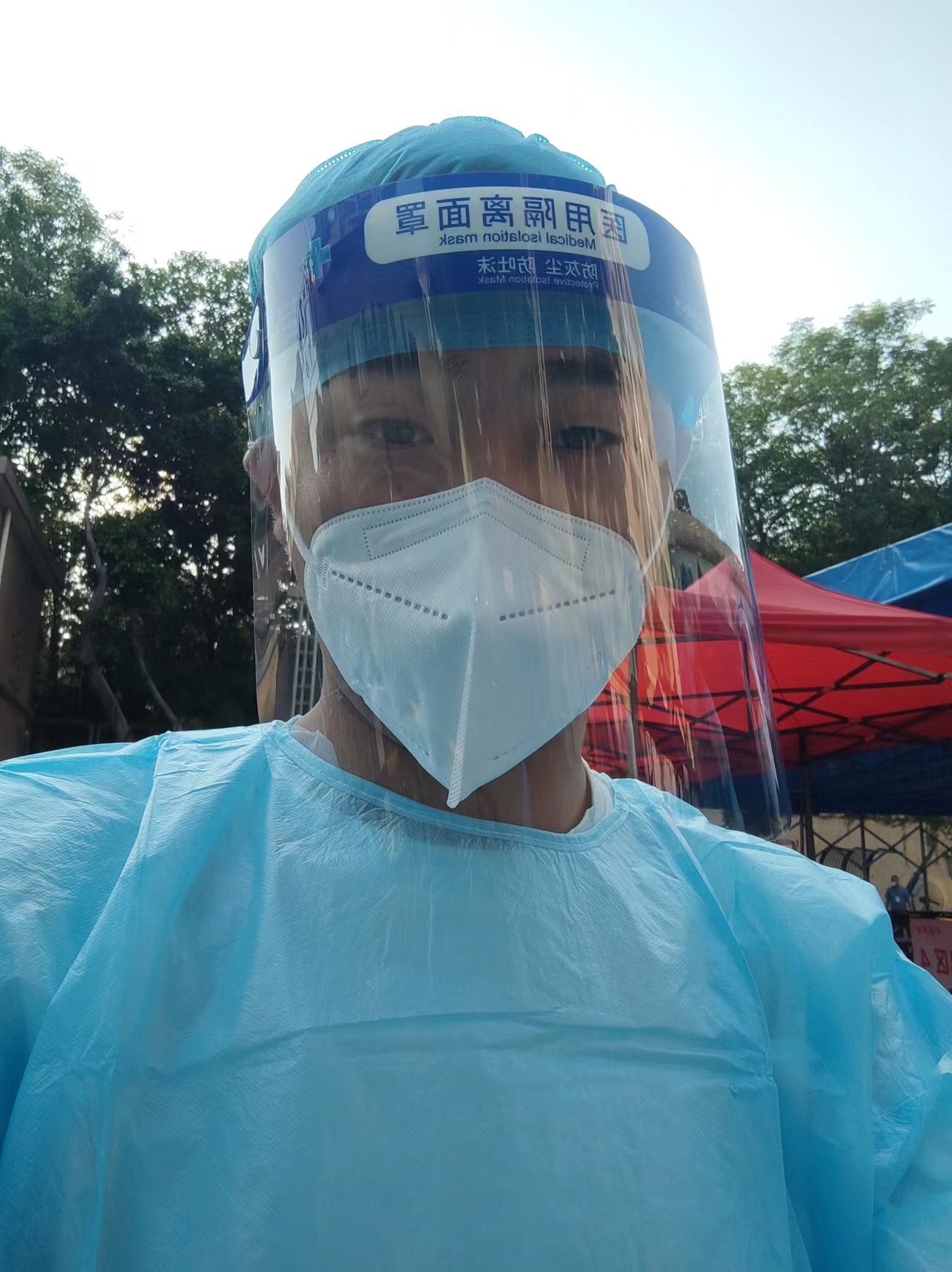 “95后”蔡晓锋是信息中心管理人员,同时也是季华实验室的一名青年党员。当佛山全体上下齐心共同全力抗击疫情之时,他通过实验室党委组织的“在职党员进社区”活动了解到深村社区在抗疫一线紧缺防疫人员、急需支援的信息后,一连五天都参加到深村社区抗疫防控的志愿者工作中,每一天都身穿着厚实的防护服处于不同防疫抗疫岗位中,为了就是能贡献自己一份“战力”。