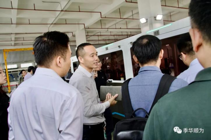 企业代表一行来到季华顺为车间,参观了从量长、裁线、剥皮、预装、压端子、插值、导通检测等全自动生产过程,实现了全工艺流程在生产线上完成,下生产线即可交付客户。是目前市场上第一条真正实现全工艺流程的物流自动输送、品质在线监测、信息实时采集的线束生产线。