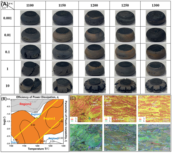 图2. (A)等温热压缩结果;(B) 0.6真应变下的热加工图;(C)1200 ℃,不同应变速率((a)(d)1 s-1, (b)(e)0.1 s-1, (c)(f)0.01 s-1)EBSD图像。