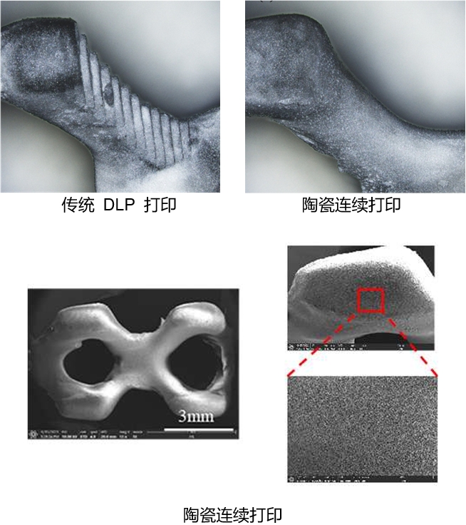 图3:传统DLP打印陶瓷件与陶瓷连续打印件微观结构对比