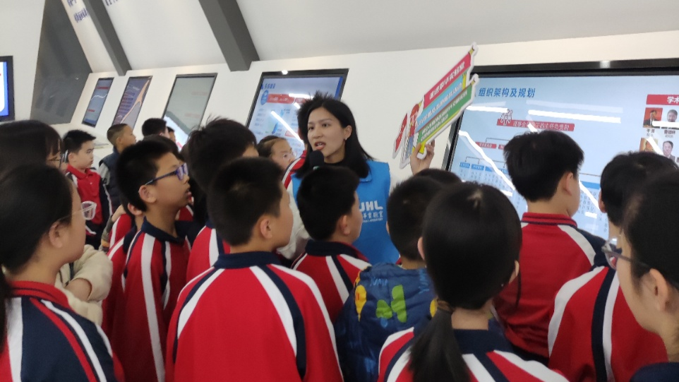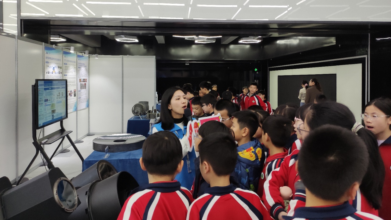 在工作人员的带领下,学生们首先参观了实验室科技成果展厅。知识产权处科普工作人员吴吉苑为师生们详细讲解了新型显示装备、半导体技术与装备、先进遥感装备、金属3D打印装备等科技成果。在趣味问答和互动交流中,学生们纷纷感叹科技的神奇与魅力。
