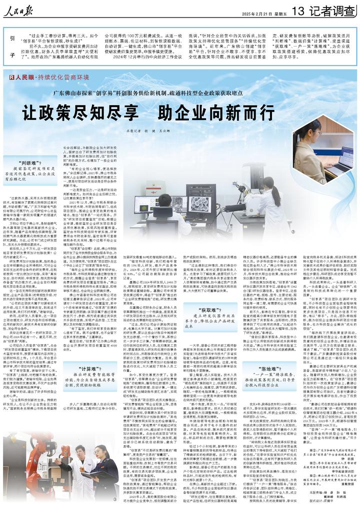 2025年2月21日,人民日报整版聚焦广东省佛山市。在《让政策尽知尽享 助企业向新而行》的新闻专题中,报道了季华实验室在政府部门的帮助下,高效推进科研仪器设备共享服务与成果转化,助力佛山企业降本增效,向新而行。